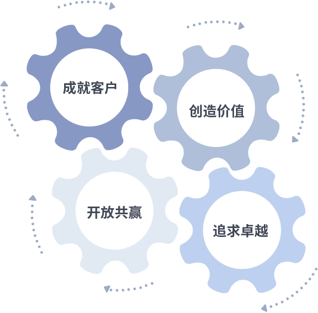 成就客户是一切决策的出发点,,创造价值是衡量所有工作的标准,,,追求卓越是我们做事做人的态度,,,开放共赢是我们的格局也是最终的结果。。。。价值观的齿轮环环相扣,,,,推动着组织里的每个人不断向前。。。。