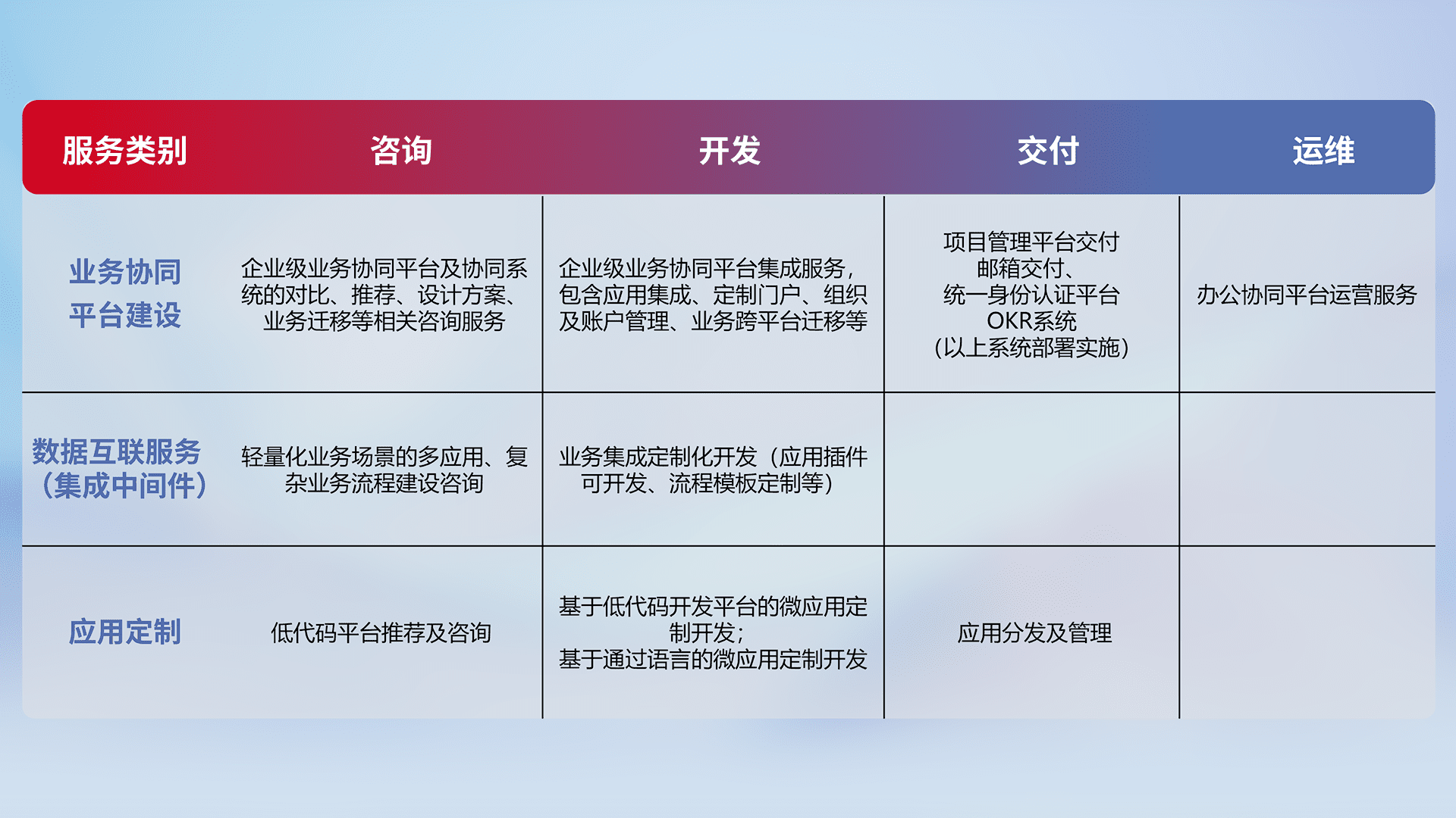 针对钉钉、、、、企微、、、IDaas等平台级产品提供产品的规划、、、方案、、交付、、、、定制化开发等服务,,,,实现如统一协同办公、、、、智能客户服务、、、、混合会议管理、、、、智能数据查询、、、等业务场景,,,,实现数字化转型。。。