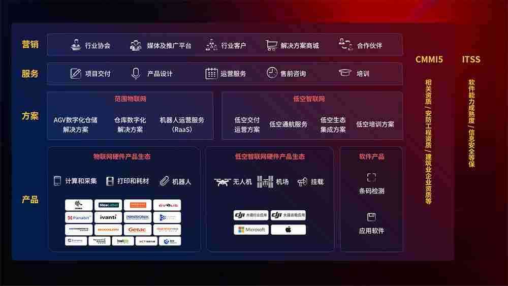 聚合国内外先进的物联网硬件产品品牌,,聚焦数字化仓储、、、机器人运营、、低空智联网等领域,,,共同打造适合客户业务场景的解决方案并提供交付服务