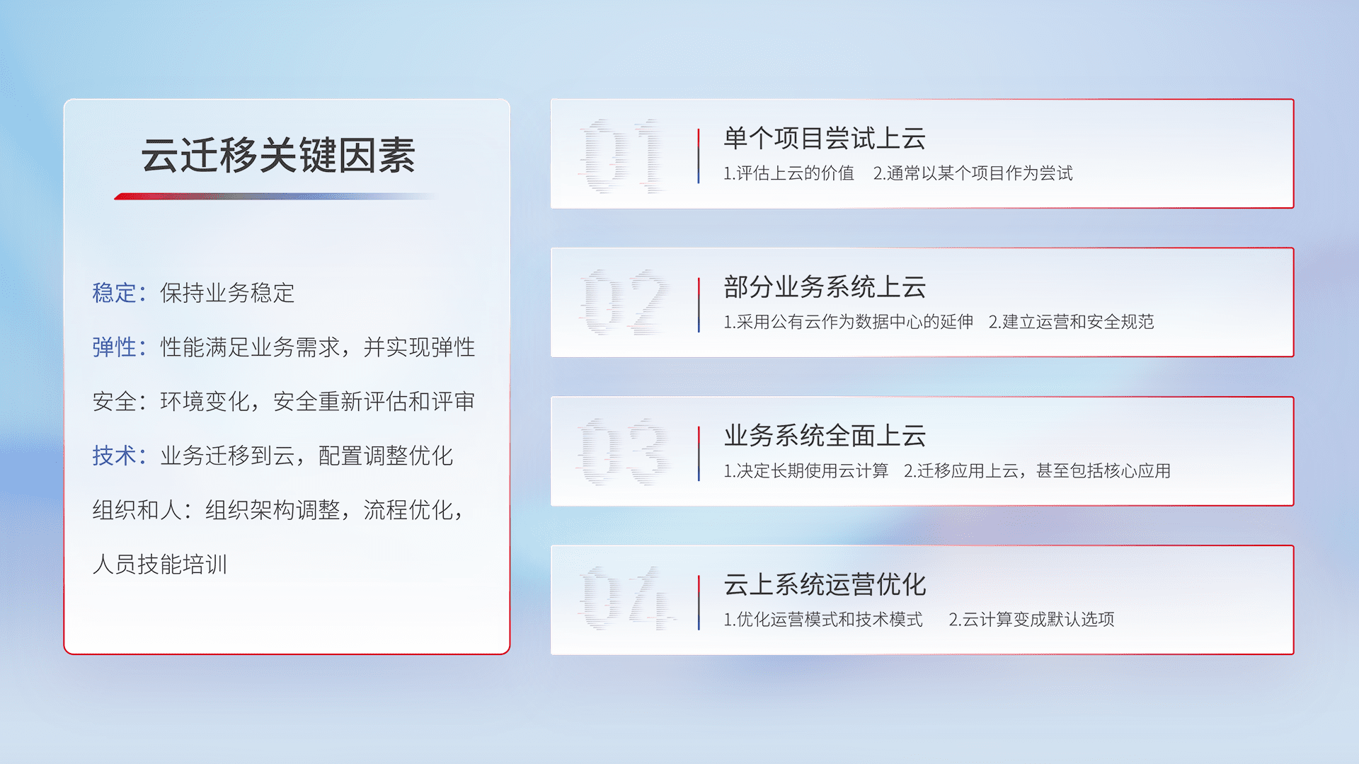 结合实际业务,,,从规划设计、、、云平台选型、、、、云原生改造、、数据迁移、、、、集成交付,,,,迁移全过程为客户识别最佳上云路径,,,,做好风险识别管理,,,,设计网络架构、、、、身份权限、、安全审计合规、、、操作审计、、、日志审计、、、监控告警策略、、、、多站点容灾设计等,,,,对云上基础设施进行整体规划,,,提升IT治理水平,,,以满足弹性、、、高可用、、、高性能的需求。。