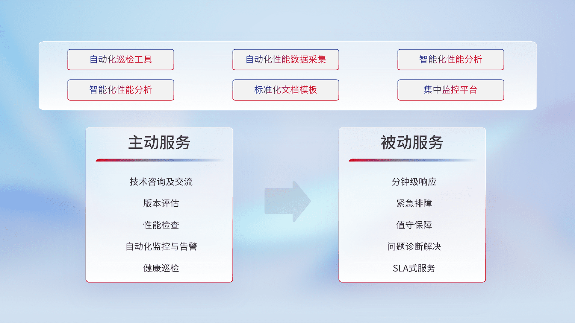 智能化工具和标准化文档,,,保障服务质量,,,提供主动服务(包含技术咨询、、、版本评估、、、、性能检查、、、自动化监控与告警、、健康巡检)和被动服务包含(分钟级响应、、、紧急排障、、、值守保障、、、、问题诊断解决、、SLA服务)。。。